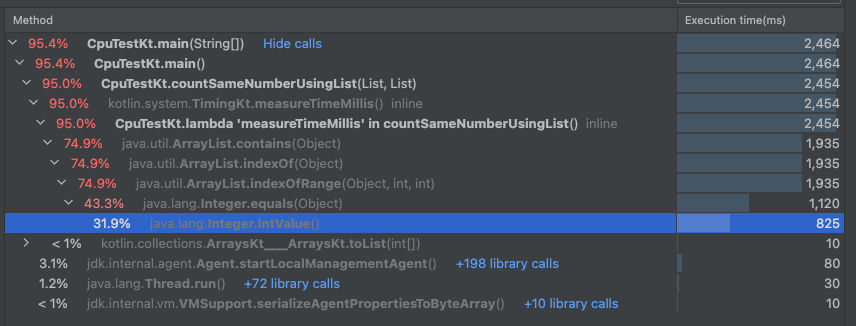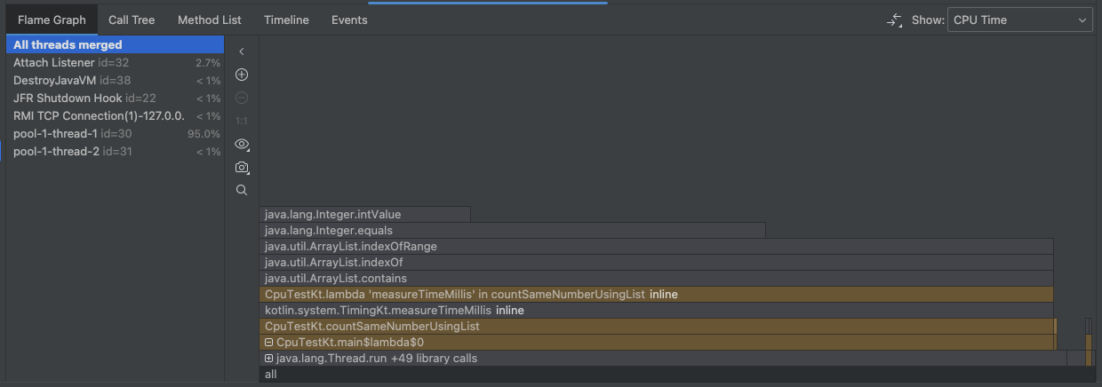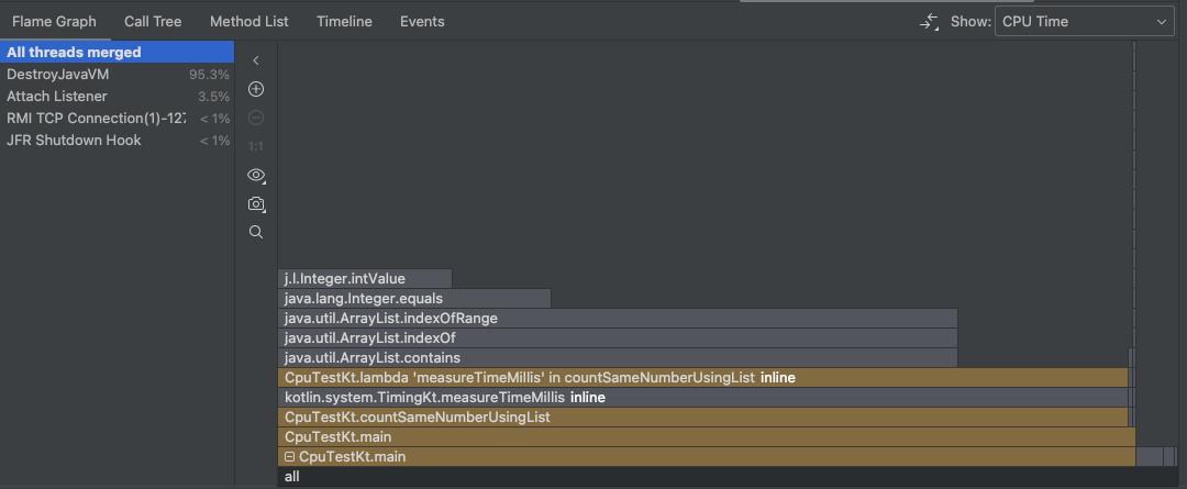 이미지를 기준으로 보자면 DestroyJavaVM이란 스레드가 대부분의 cpu를 사용했고, countSameNumberUsingList -> measureTimeMillis -> ArrayList.contains 메소드가 대부분의 cpu를 사용했다는 점을 확인 할 수 있다.