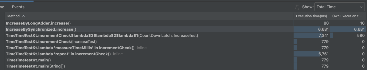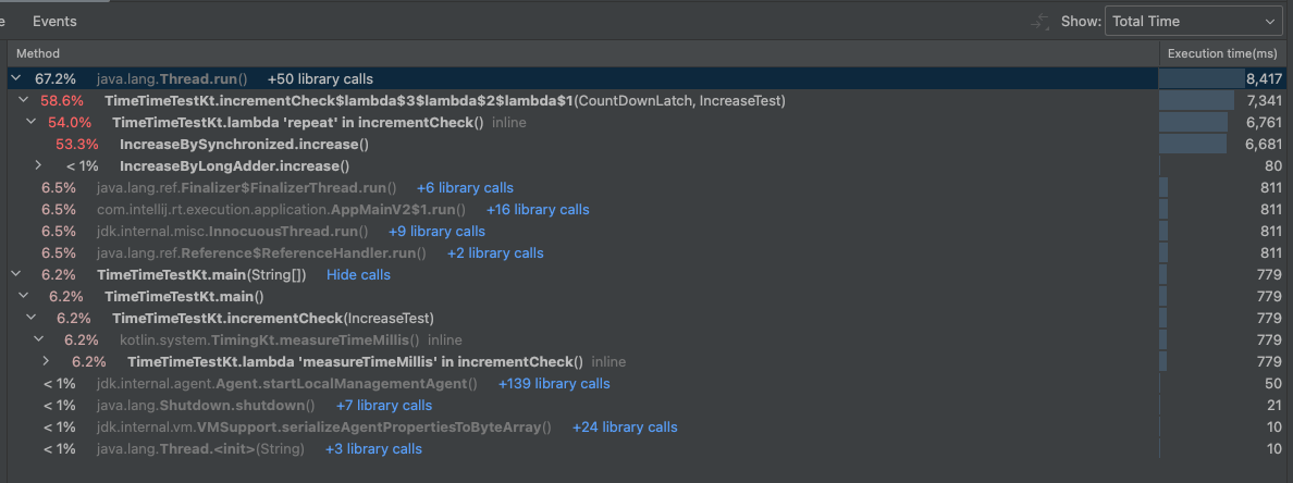 // counter=20000000, elapsed(ms)=54, className=IncreaseByLongAdder10개의 스레드가 동시에 공통변수의 숫자를 하나씩 2,000,000번 증가시키는 코드인데 thread safe를 보장하기 위해 첫번째 방법은 synchronized을 사용하고 두번째 방법은 LongAdder를 사용해서 thread safe를 보장하였다. 앞서 사용한 방식과 동일하게 IntelliJ Profiler를 돌리면 Intellij 코드에 아래와 같이 메소드별 걸린 시간도 표기해준다.
